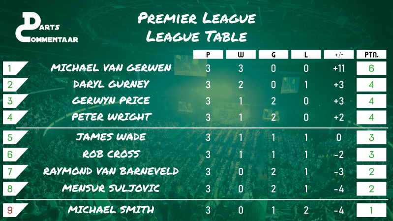 Regerend Premier League kampioen van Gerwen heeft tot nu toe een perfecte start aan zijn Premier League seizoen gehad. Hij won zijn eerste drie wedstrijden.