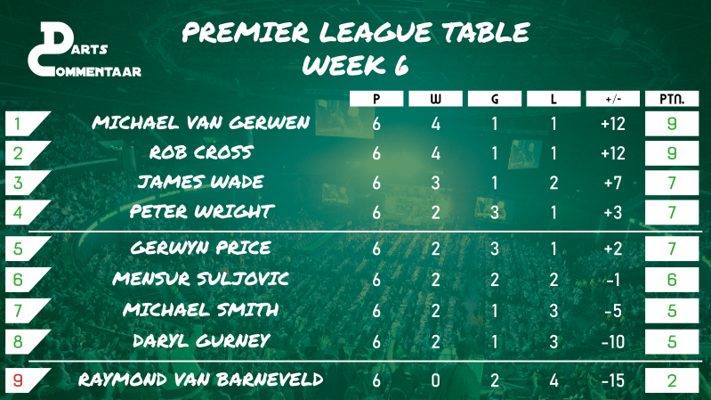 Dat was het beste dat het werd voor de Nederlander. Cross gooide nog een 129 finish toen hij vijf van de volgende zes legs pakte. Van Barneveld blijft onderaan staan in de League Table.