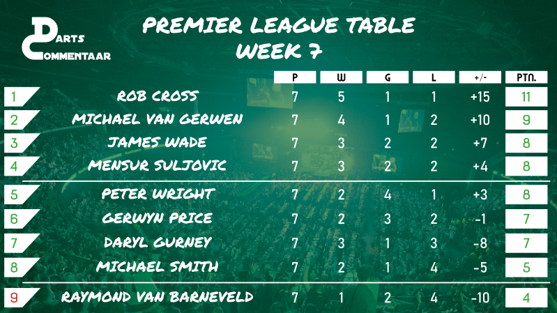 Aan de andere kant van de League Table moet Michael van Gerwen moeite doen om terug aan de leiding te komen. Op dit moment heeft Rob Cross de nummer één positie in de Premier League.