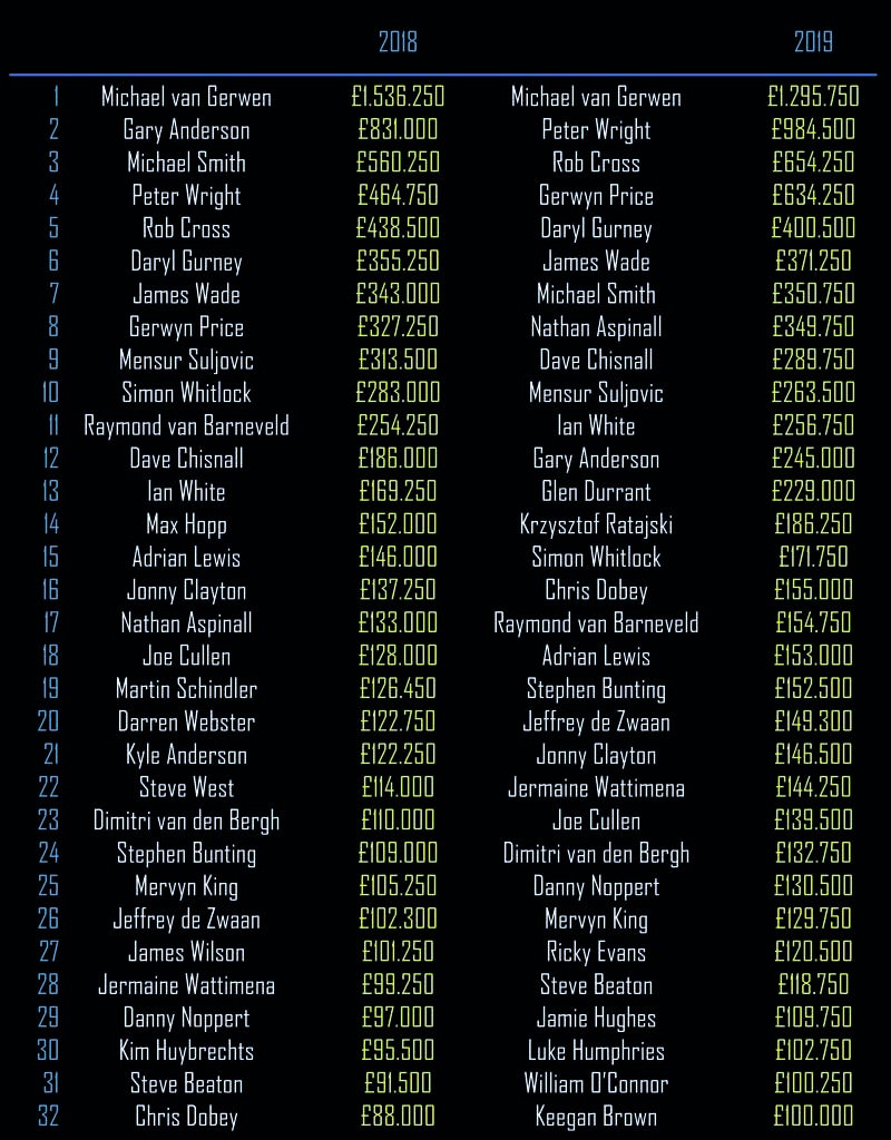 HEARN: "Our annual comparison of earnings on the PDC circuit always makes for interesting reading year-on-year, and I'm delighted to see the majority of the top 32 places increasing during 2019/20,