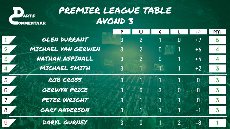 Belangrijke finishes en het snel in vorm komen van Glen Durrant heeft hem geholpen naar winst in twee van zijn drie Premier League wedstrijden tot nu. Afgelopen donderdag won hij met 7-4 van Gary Anderson.